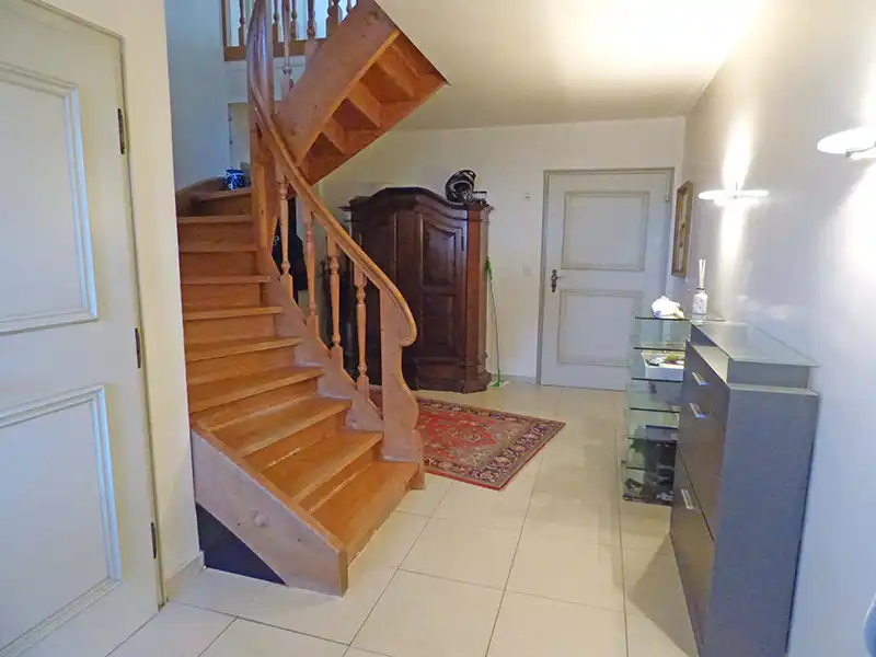 Im Erdgeschoss befinden sich ein einladender Eingangsbereich mit Gäste-WC, zwei vielseitig nutzbare Zimmer, ein Duschbad mit integrierter Sauna sowie drei praktische Kellerräume. Über eine stilvolle Holztreppe gelangt man in das nächste Stockwerk.