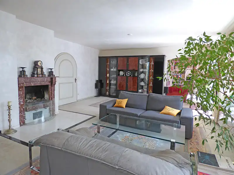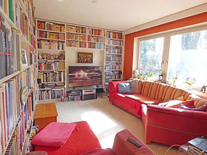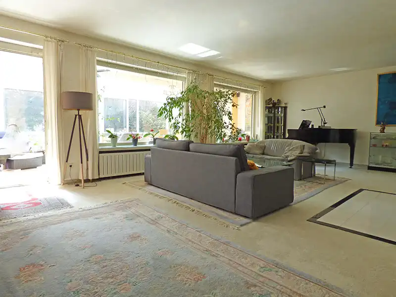 Das Gartengeschoss bietet ein großzügiges Wohnzimmer (ca. 46 m²) mit angrenzendem Fernsehzimmer und separatem Essbereich. Vom Wohnzimmer aus hat man Zugang zum Wintergarten (ca. 30 m²), der zusätzlichen Wohnkomfort schafft, und dem großen, blickgeschützten Garten. Eine separate Küche, eine Abstellkammer, ein Schlafzimmer samt begehbarem Kleiderschrank und Badezimmer mit Dusche und Badewanne runden diese Etage ab.